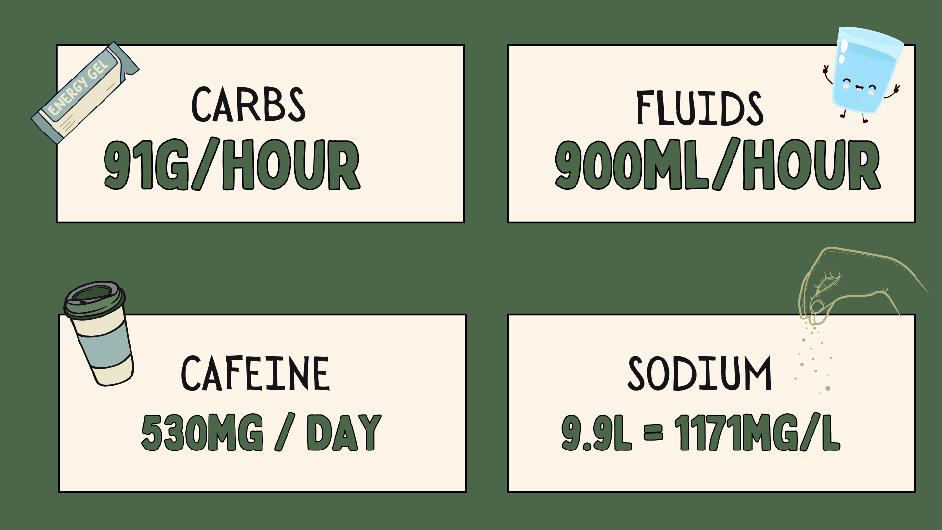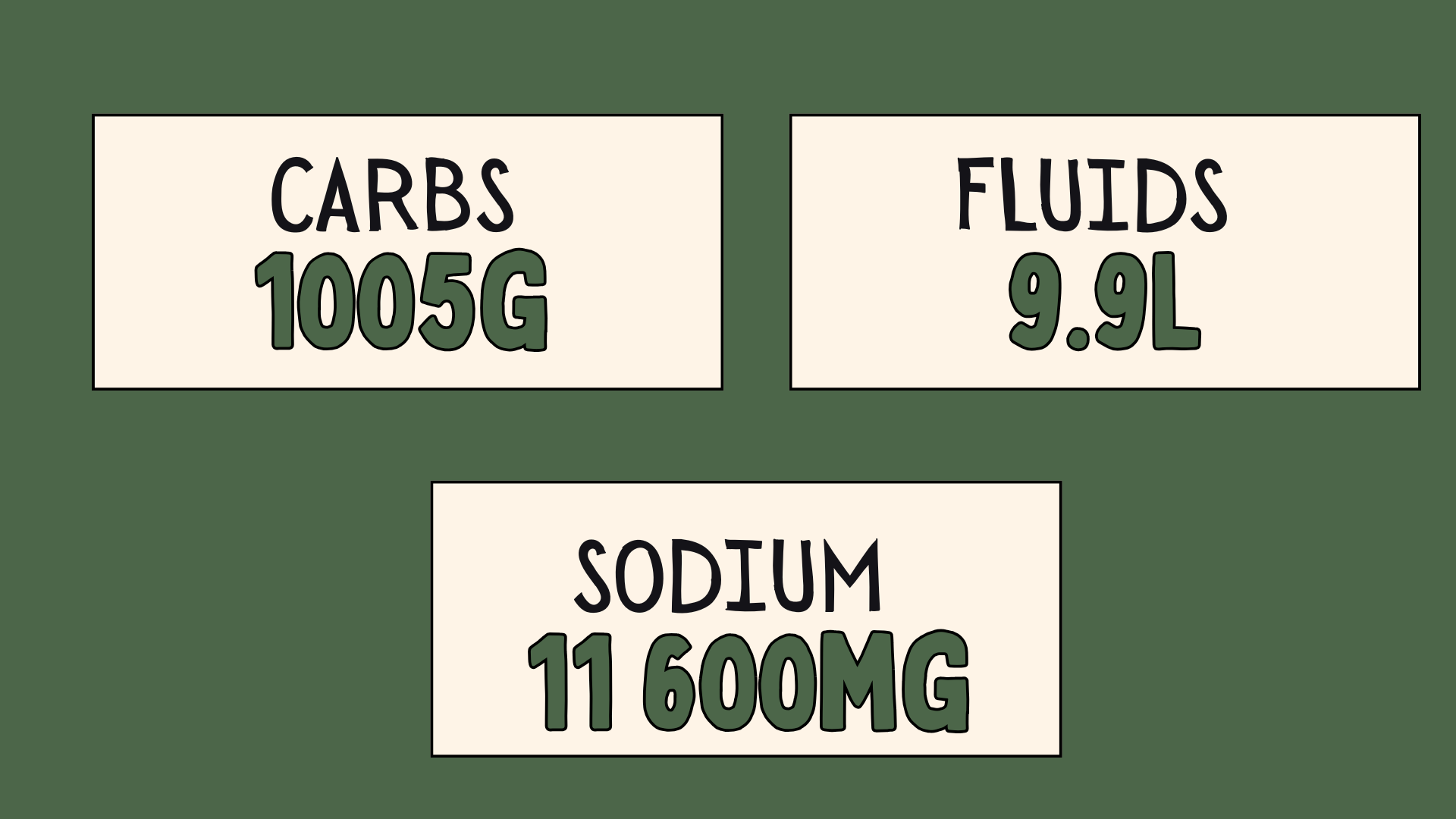 Total for run: 290g carbs, ~2.9L fluids, 3850mg sodium